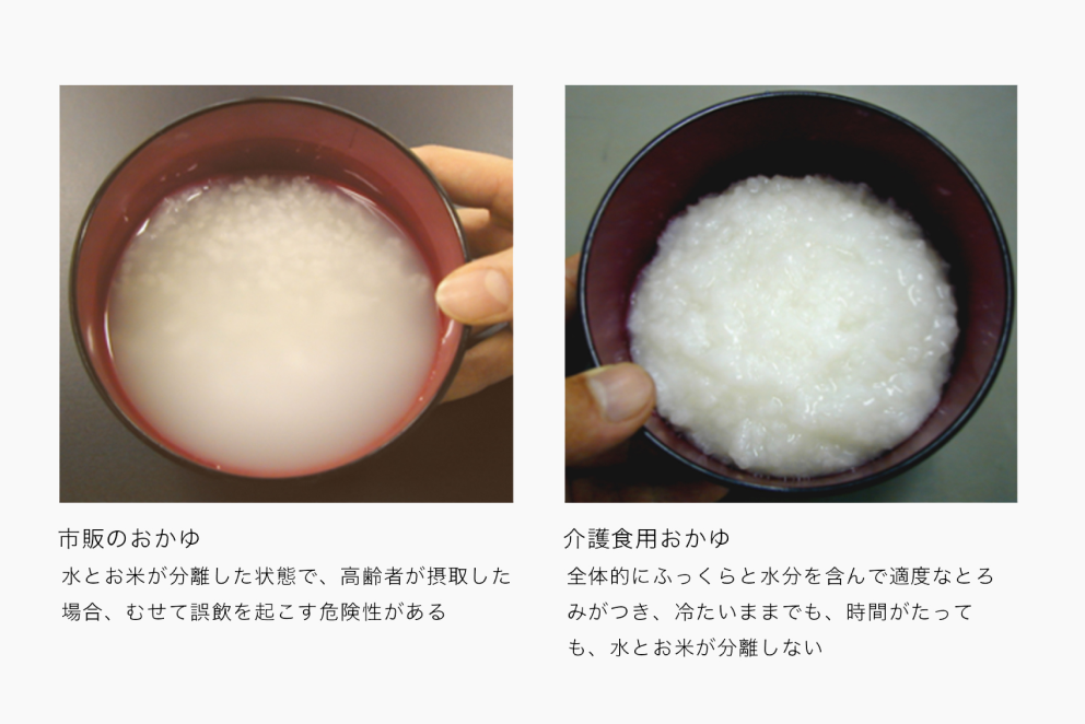 1998年介護保険制度導入の方針が打ち出され、高齢者が増えていく中、お米を研究している亀田製菓で何かできないだろうか?と考えて生まれた『ふっくらおかゆ』は適度なとろみと舌でつぶせるやわらかさが特長です。冷めてもお米と水が分離しないので、口の中でべたつかず、なめらかな食べやすさです。お米はコシヒカリを100%使用し、独自の二度炊き製法によってお米の粒感を残しながら仕上げた、どなたにも食べやすいユニバサールデザインフードです。