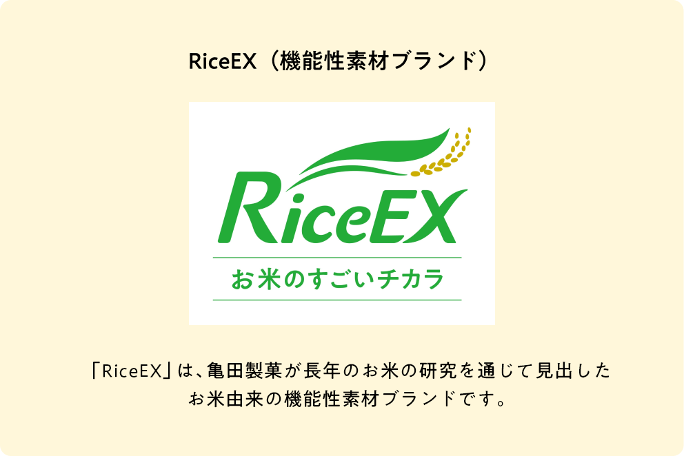 亀田製菓の長年の研究の成果により誕生した、お米由来の植物性乳酸菌K-1、K-2。いずれも機能性表示食品制度に対応した健康効果が認められた菌です。殺菌菌体なので用途も幅広く、健康食品、一般加工食品、お菓子、飲料などへの活用が可能です。『ハイハイン』や『白い風船』などの当社の米菓に加えるだけでなく、食品メーカーなどに素材を販売する B to B 取引に注力しており、幅広い商品を通じてお客様の健康に役立てられています。今後は亀田製菓のお米由来の機能性素材ブランド『RiceEX』の一素材として、国内だけでなく海外展開にも注力し、更なる普及を目指していきます。