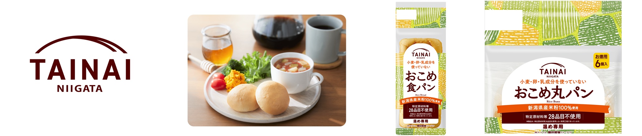 グループ会社のタイナイはアレルギー特定原材料等28品目不使用の専用工場で米粉パンを製造しています。国産米100%でアレルゲンフリー、グルテンフリーのこの米粉パンは日本でも年々増加している食物アレルギーをお持ちの方や、グルテン不耐症の方でも安心して召し上がっていただけます。『おこめが、かなえる Happy Bakery』ブランドでは、誰もが楽しめる笑顔で囲む食卓の実現を目指して、米粉パンの普及に努めています。