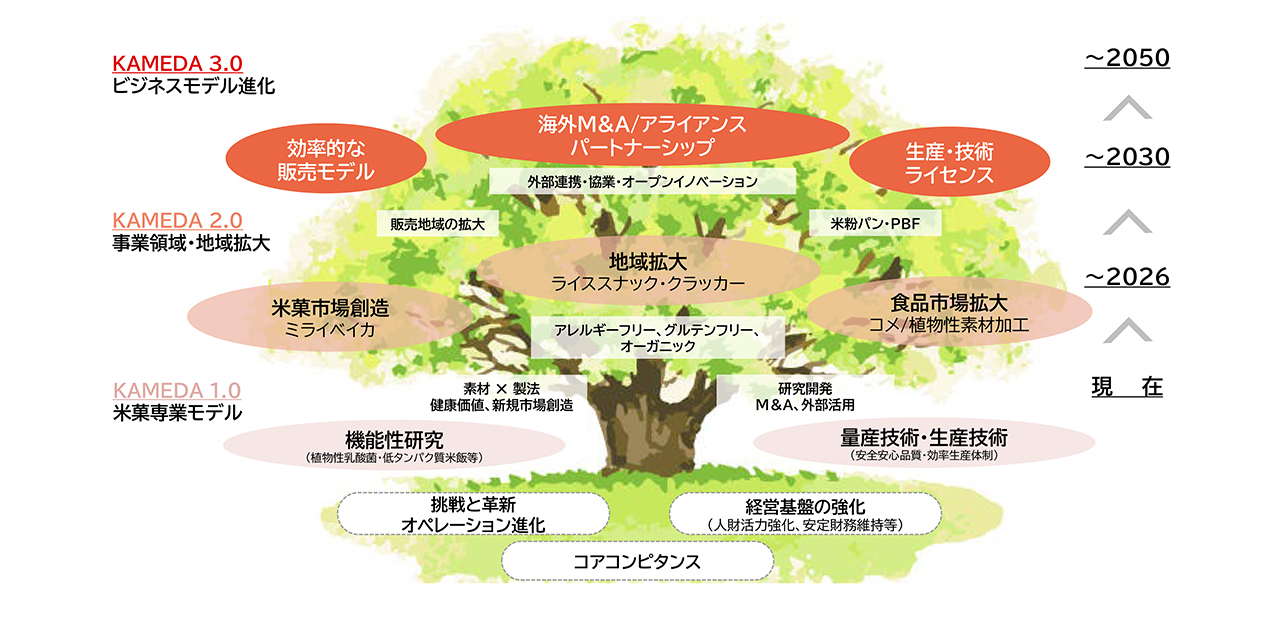 亀田製菓グループの価値創造プロセスと、目指す姿Rice Innovation Companyの実現に向けた進化の方向性を大木に重ね合わせています。最高のアイデアと技術、ノウハウによって木の幹を太くし、事業や地域を枝と葉のように広げ、そして高く上へ上へと成長していく姿をビジネスモデルの進化として表現しています。