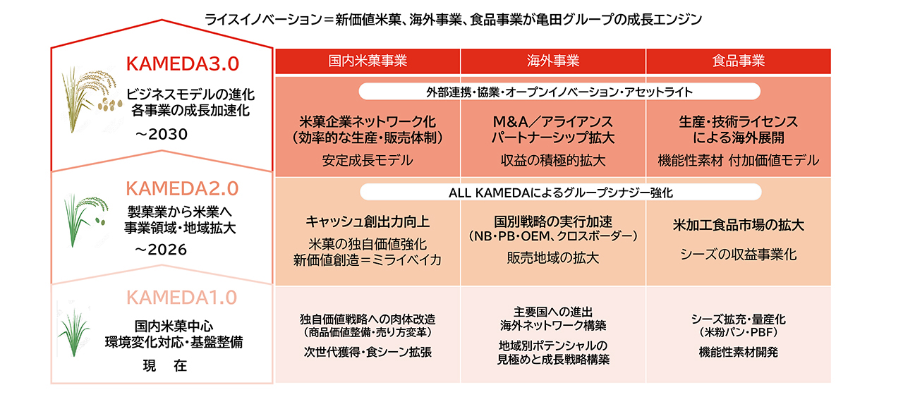 ビジネスモデルは進化していきますが、事業ドメインに揺らぎはなく国内米菓事業、海外事業、食品事業の3事業で拡大を図っていきます。ライスイノベーションカンパニーへの進化に向けて、お米の研究開発力、加工・量産技術力、ブランド力という強みをさらに磨き上げ、各事業で独自価値を創出していきます。