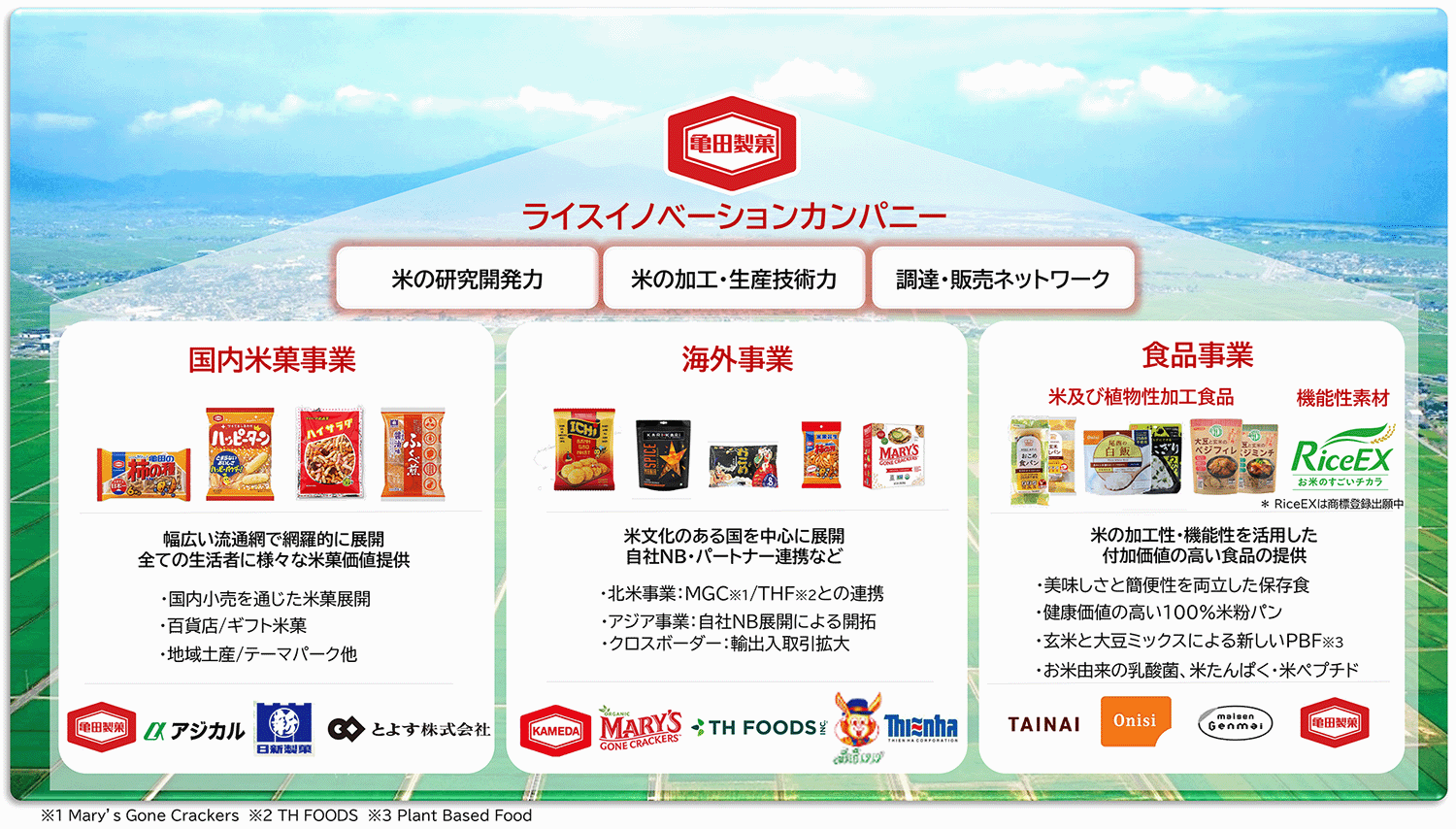 亀田製菓グループは、主力の米菓事業を軸に、北米事業の成長と国内米菓の収益力強化という二本の大黒柱と、もう一つの柱である食品事業の収益基盤確立により、持続的成長を推進します。当社の米菓製造技術を活かし日本・北米・アジアのシナジーを最大化するとともに、国内米菓事業においてもこれまでの個社最適の考え方からグループ全社最適によるシナジーを創出し、より柔軟に顧客需要に対応する体制を構築します。食品事業では災害、環境問題、アレルギー、食料不足などの社会的ニーズを捉えたシーズ事業の収益化を推進してまいります。
