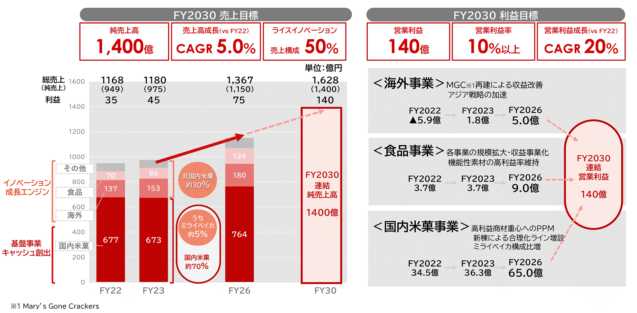 上記前提のもとで、亀田製菓グループの調整後営業利益は、27年度に115億円、30年度に145億円の達成を目指します。