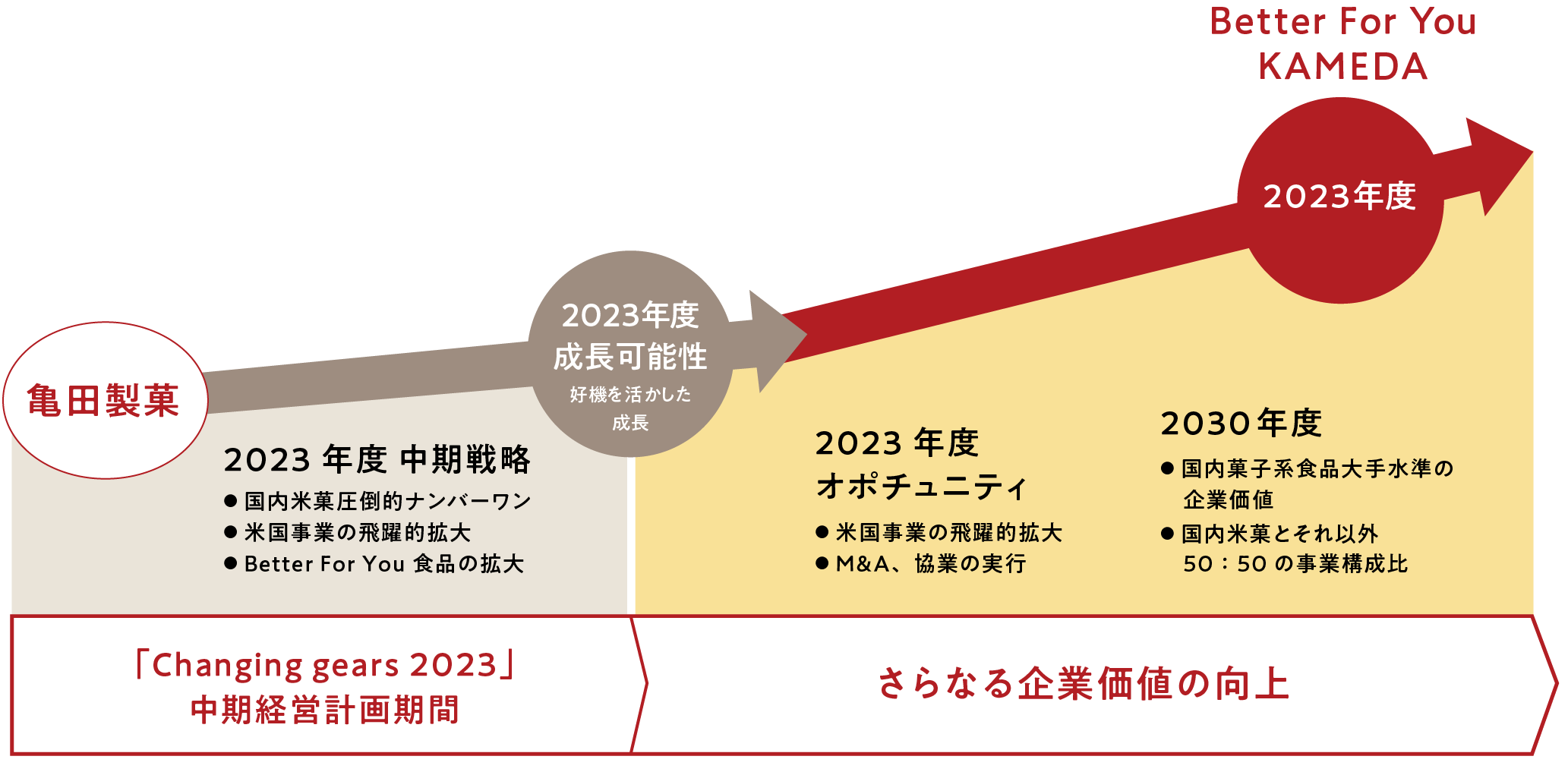 中長期計画の前半にあたる2027年度までに亀田製菓グループの成長基盤を確立し、後半の2030年度までに全事業の収益性を加速させることで、グローバル化を進展していきます。