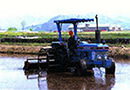 良い土をつくるため、水田に稲わらやたい肥・肥料をまき、トラクターで掘り起こします。ここに水をはって平らにします。