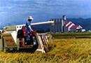 黄金色の稲穂が垂れ下がると稲刈りです。最近のコンバインは何列も同時に稲を刈り、実を採る脱穀や稲わらを切ることも同時にできます。