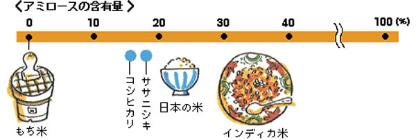 お米の主な成分は、水分・でんぷん・たんぱく質・脂質・ミネラルで、これらが一定の数値でバランスよく配合されているお米がおいしいとされています。さらに、でんぷんにはアミロースとアミロペクチンの2種類があり、ねばりとかたさのバランスは、この2種類の比率によって決まります。アミロペクチンが多いお米は、ねばりがあり、ほどよい歯ごたえがあります。一方、アミロースが多いお米はかたく、パサパサしています。しかし、アミロースが少ないとおいしいというわけでもなく、コシヒカリ、ササニシキなどの含有バランスが理想的といわれています。また、同じ品種でも稲が育つ気温によって含有量が異なってくる場合があります。その対策としての品種開発もすでに行われています。
