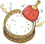 - 木しゃもじで切るように混ぜながら、うちわか扇風機で手早く冷まして、ご飯に酢の味をなじませます。