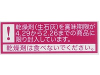 また、商品によっては一定の期間だけ乾燥剤を入れているものもあります。その場合は「乾燥剤(生石灰)を賞味期限が○.○から○.○までの商品に限り封入しています。」と表示しています。
