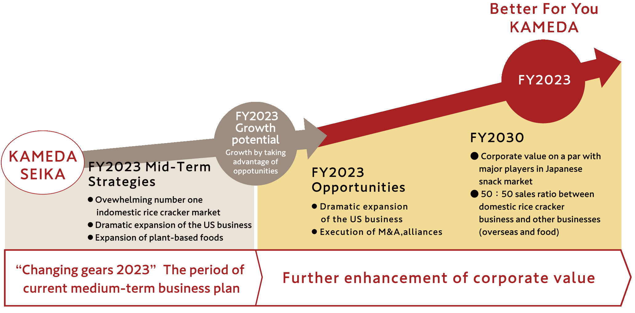 While our business model continues to evolve, our three business domain of Domestic Rice Cracker Business, Overseas Business, and Food Business will be unchanged. To evolve into a Rice Innovation Company, we will further refine our strengths in rice R&D, processing & mass production technology, and branding to enhance our unique value in each business.