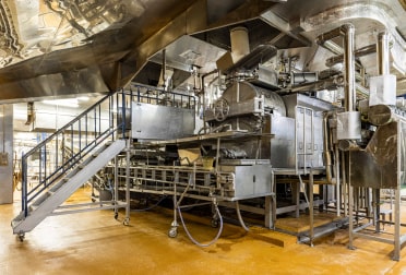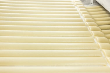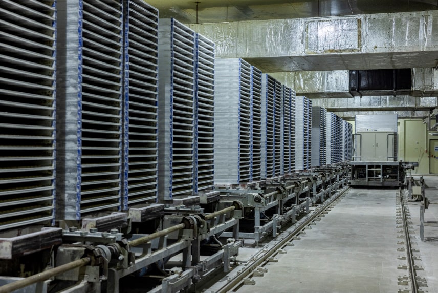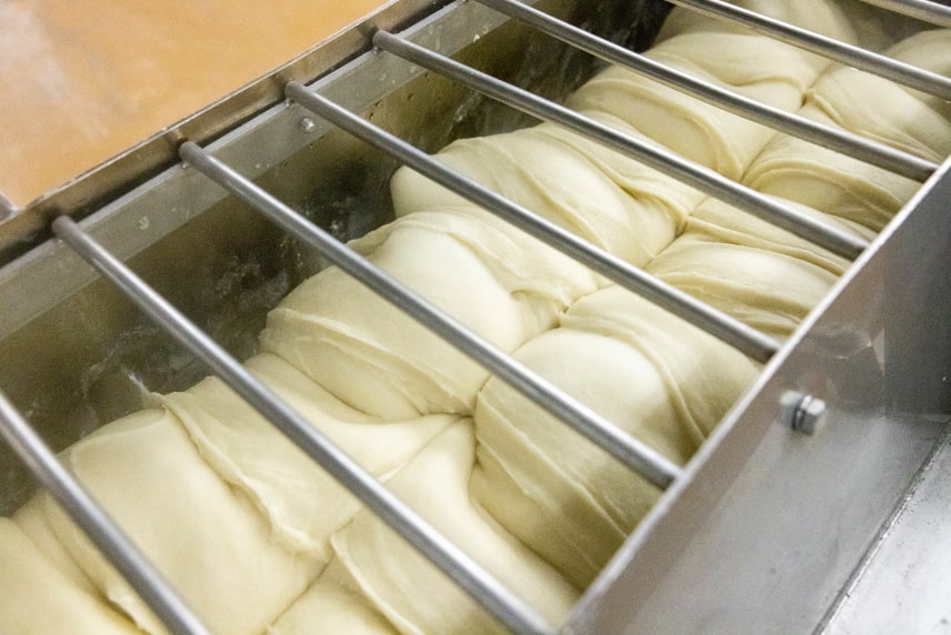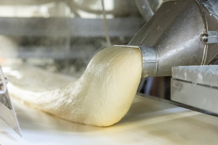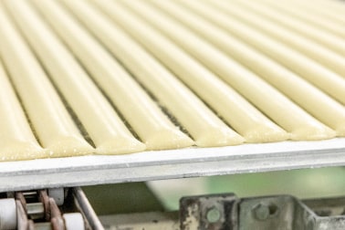 成型した生地はまだやわらかいため、冷蔵庫へ自動搬送し18時間程寝かせます。十分に冷やすことで生地が硬くなり、後工程の時に一定の厚さでの切断がしやすくなります。