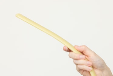 生地を練りながら空気と水を絡めます。この時できる空気の粒が、柿の種のカリッとした食感作りにつながります。練った生地は細長い棒状にし、一定の長さにカット。その断面は、柿の種の原型である半月型になっています。
