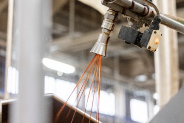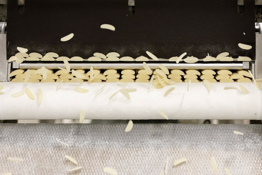 冷やした生地を高速カッターで約1.6mmの厚さに切断。1秒間におよそ1,500粒の柿の種型の生地ができあがります。焼くときのふくらみと食感に関わるため、生地の硬さを調べながら一定の厚さで切断できるようにします。