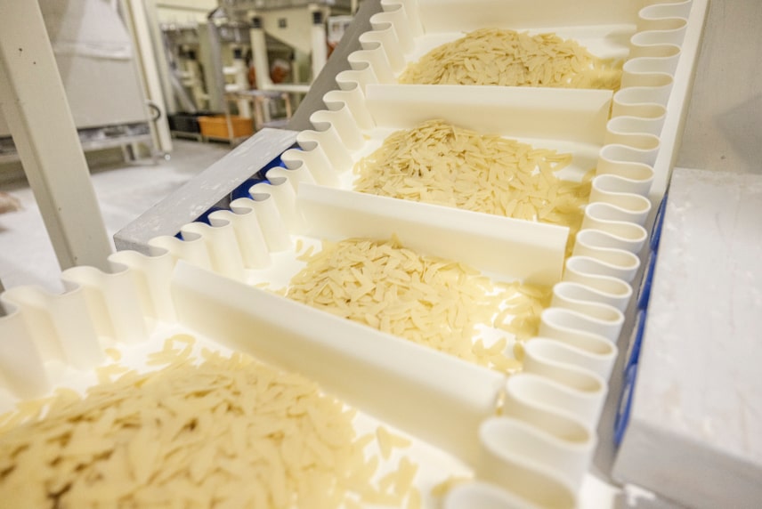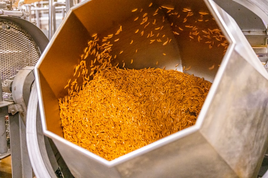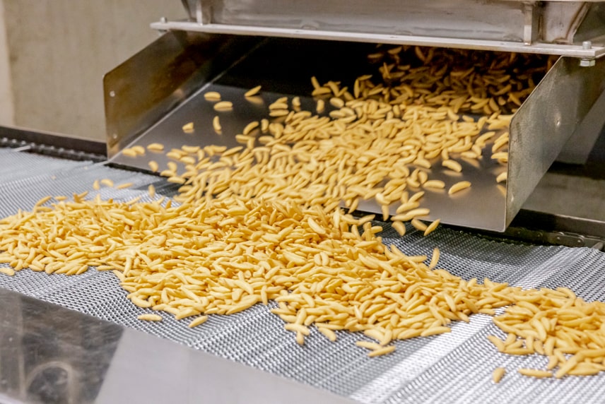 切断した生地を乾燥機に通し、最適な水分量になるまで乾燥させます。生地に残る水分量が不安定だと、後工程でふくらまなかったり破裂してしまったりするためです。乾燥後は、水分が均一に広がるよう3時間ほど寝かせます。その後、色彩選別機を通して、形が崩れたものを取り除きます。