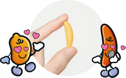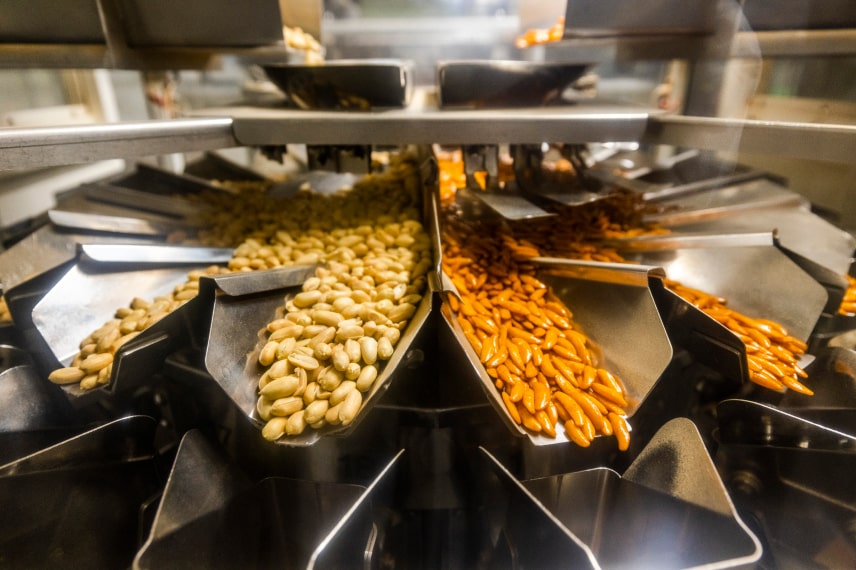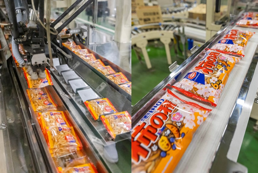 パラレルロボットが、すばやく個包装された柿の種を6袋ごとに並べ、ひとつの大袋に詰めます。これで「亀田の柿の種」が完成です。