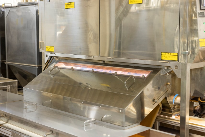「焼き」や「味付け」の際に、欠けや割れなど形が崩れるものが出てきてしまう場合があります。そういったものを、色彩選別機にかけて取り除きます。選別は、生地の切断後と味付け後の二度、しっかりと行っています。