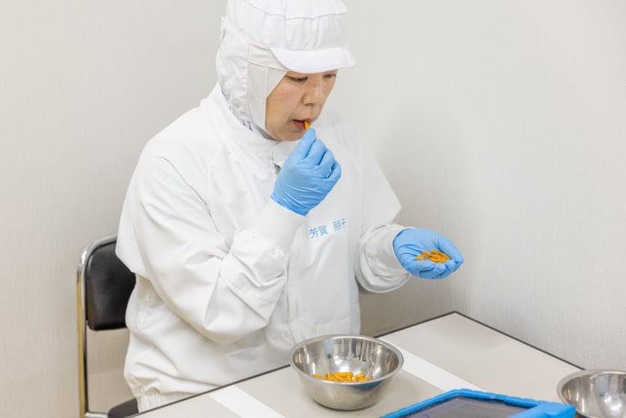 検査は機械によるものだけではありません。味などのチェックは、食味検査員が実際に食べて行います。検査員は1時間に1回、その日にできた柿の種と、2〜3日前にできた柿の種を食べ比べ、鼻に抜ける香り、舌触りやのどごしを確認。厳しい試験をクリアした検査員によって、味の品質がしっかり守られています。