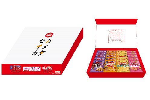 〈カメダセイカ〉限定の4つの商品、『亀田の柿の種 揚げ種 追いがけ醤油味』『亀田の柿の種 ハッピーターン味』『ハッピーターン 至福のチーズ味ミニ』『ハッピーターン ぜーんぶハートのいちご味』が入った、手土産におすすめのアソートボックスです。