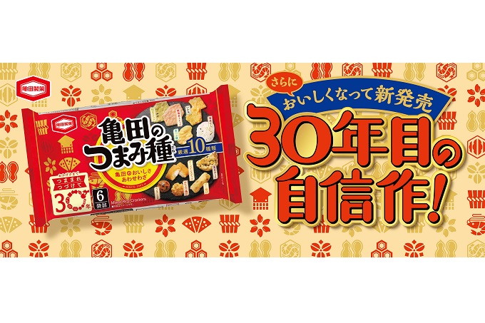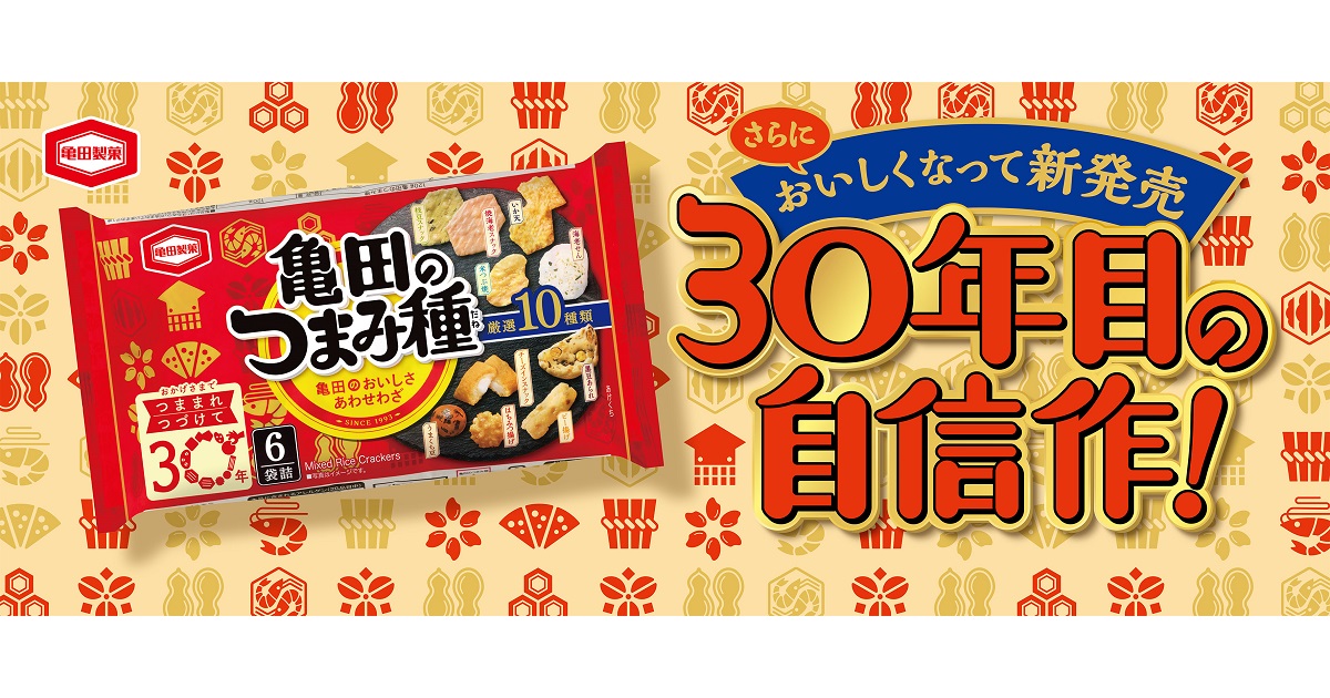 1個包装で10種類の味わいが楽しめるバラエティーの豊かさが魅力の『つまみ種』。1993年の発売以来29年にわたり、お客様に愛されてきました。今回、発売30周年を迎えるのを機に商品名を新たに『亀田のつまみ種』に変更し、さらにおいしく生まれ変わります。商品の中央に大きく商品名を記載し、亀田製菓が自信を持ってお届けする商品であることをお客様にもアピールいたします。
