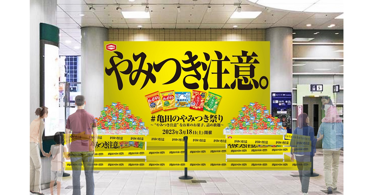 2023年3月17日(金)・3月18日(土)の2日間、渋谷・マークイベントスクエアにて亀田製菓の「“やみつき注意”なお米のお菓子」の山積みの展示と、高さ約4mの大型グラフィックを設置いたします。