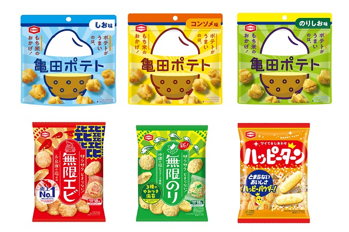 詰め放題の対象となるお菓子には、『亀田ポテト しお味』、『無限エビ』、『無限のり』、『ハッピーターン』、また、今後発売を予定しているハッピーターンの新商品を合わせた5商品を用意。『亀田ポテト』は3月20日(月)に関東地方に初上陸します。