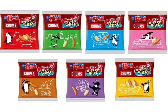 『164g 亀田の柿の種 チャムスオリジナルBBQ味』は、個包装のデザインもコラボレーション限定パッケージに。全7種類のカラフルなデザインをランダムに封入しています。CHUMSのアイコンである「ブービーバード」の仲間たち「ブービーフレンズ」たちと一緒にアウトドア気分を楽しめます。
