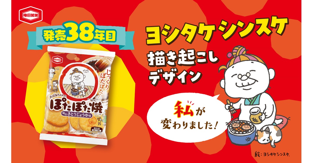1986年に発売した『ぽたぽた焼』は、濃厚なさとうじょうゆの甘じょっぱさとサクサクとした軽い食感でお子さまでも食べやすいことから、親子をつなぐコミュニケーション菓子としてこれまで幅広い世代にご愛顧いただいてきました。そして発売当初からパッケージに佇む「おばあちゃん」は商品の象徴として多くの方に認知され、昨今ではSNSでも話題に上がるなど、世代を超えて根強い人気を誇っています。