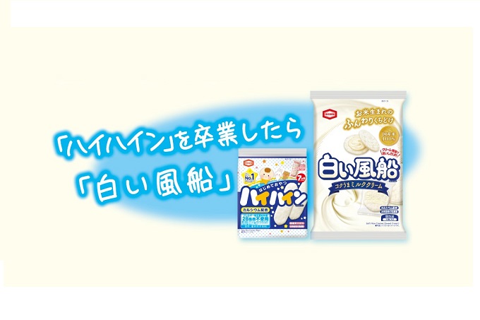 今回、幼児をもつ親の「親子でいっしょにおやつを食べたい」というニーズにお応えして、お子様だけではなくお父さん・お母さんも一緒に楽しめる、大人もついつい食べたくなる商品にリニューアルいたします。「ハイハイン」を卒業したら、親子で一緒に「白い風船」デビューをお楽しみください。