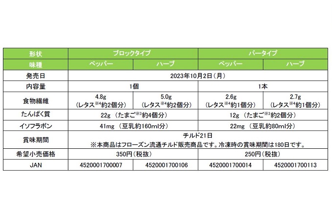 これ1つで、たんぱく質をたまご※3約2個分(バータイプ)から約4個分(ブロックタイプ)、食物繊維をレタス※4約1個分(バータイプ)から約2個分(ブロックタイプ)、イソフラボンを豆乳約80ml分(バータイプ)から約160ml分(ブロックタイプ)を摂取できます。袋を開けてそのまま食べられるため、より気軽に自然に、身体が喜ぶ栄養を摂り入れることができます。