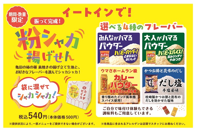 東京おかしランドのカメダセイカでは、併設のキッチンで作った出来立ての商品をお楽しみいただけます。今回、出来立て商品として『粉シャカ揚げせん 亀田の柿の種 素焼き』を新発売します。4種の中からお好きなフレーバーパウダーを選択し、揚げ立ての亀田の柿の種 素焼きの生地と一緒に紙袋でシャカシャカ振って完成です。選べる4種のフレーバーパウダーの他にも、ご自分で味付け体験ができる調味料もご用意しています。ご自分だけのオリジナル「亀田の柿の種」を、ぜひお試しください。