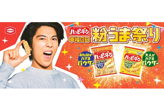 5月29日の幸福の日にちなんで、「ハッピーターン 幸福の日 粉うま祭り」キャンペーンを実施しています。ご応募いただいた方には抽選で「ハッピーパウダー&ハッピースパイス“粉だけ”」や「ハッピーターンBIG抱き枕」など『ハッピーターン』ならではの賞品が当たります。本キャンペーンに関する詳細はキャンペーンサイトをご参照ください。