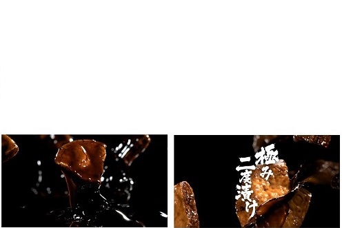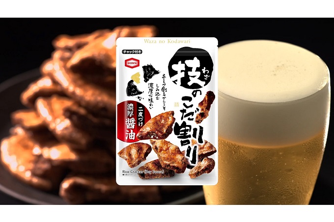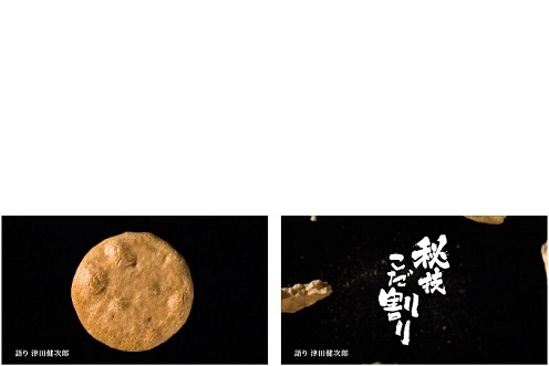 丸い堅焼きせんべいをあえて割り、特製醤油だれをしみ込ませることで濃厚な味わいに仕上げる「技」を使って作られている『技のこだ割り』。新CMでは、ナレーションを担当する声優の津田健次郎さんの“声”によって、丸い堅焼きせんべいが『技のこだ割り』に変貌していく様子を、高揚感の機微や、セリフの発し方で表現しています。津田健次郎さんの熱のこもった必殺技風のナレーションに注目です。