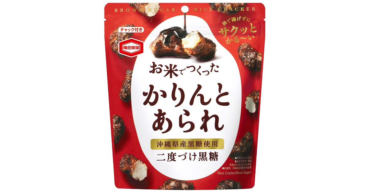 『お米でつくったかりんとあられ 黒糖』は、創業以来培ってきた亀田製菓のお米の加工技術や特性を活かして実現した、かるい食感が魅力の米菓です。素材の味を最大限に生かすお米の生地を油で揚げずに窯で焼いた後、特殊製法を使って仕上げることで、驚きのサクッとかるい食感に仕上げました。