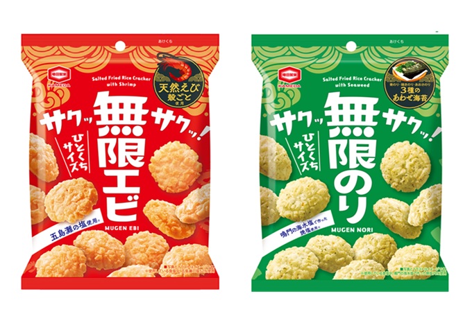 コンビニエンスストア限定で発売する『35g 無限エビ』『35g 無限のり』は、レギュラー商品よりも一回り小さい小丸サイズの生地を使用しています。個包装しておらず、ひとくちサイズのため、サクサク一気に食べたいときにぴったりです。