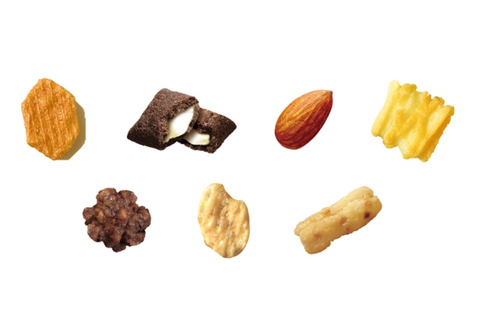 《午後のつまみ種 おやつラインナップ》下記の7種類のおつまみが1個包装でお楽しみいただけます。
