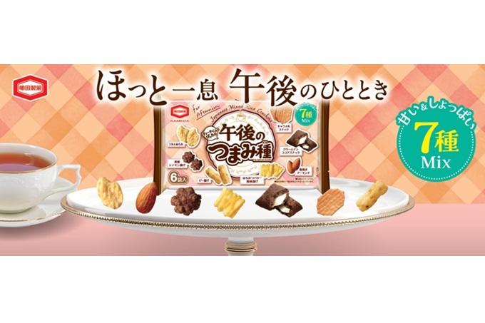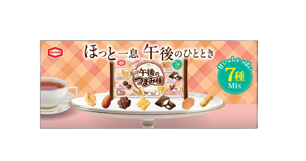 「亀田のつまみ種」シリーズは、いろいろなものを少しずつ、つまんで食べたい方にぴったりのミックス米菓です。味や食感、見た目が違う数種類の多種多彩なおいしさを1個包装でお楽しみいただけます。『午後のつまみ種』は1個包装で“甘い”と“しょっぱい”を一度に楽しむことができ、発売以来おやつタイムに楽しむ商品としてお客様にご愛顧いただいています。今回、より“午後のおやつタイム”にぴったりな商品に生まれ変わるべく、封入しているおやつのラインナップを変更します。「はちみつ揚げ」に代わり、コーヒーとも相性の良い「キャラメルスナック」が新たに加わります。ほっと一息つきたいときや気分転換したいときに、お好きな飲み物と一緒にお楽しみください。