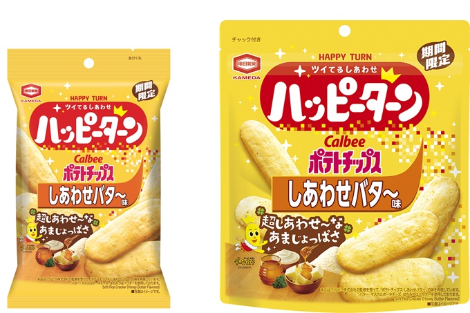 『ハッピーターン しあわせバタ~味』は、あまじょっぱい味わいのハッピーパウダーが特長である亀田製菓の『ハッピーターン』と、カルビーのポテトチップスの中で唯一無二のあまじょっぱいフレーバーである『ポテトチップス しあわせバタ~』がコラボレーションした商品です。カルビー監修のもと、『ポテトチップスしあわせバタ~』の味わいを再現するため、原料にポテトを使用してポテトチップスならではの風味を表現しています。さらに、『ポテトチップス しあわせバタ~』の4つのしあわせ素材(バター、マスカルポーネチーズ、はちみつ、パセリ)とハッピーパウダーを組み合わせることで、超しあわせなあまじょっぱさを実現しています。期間限定の特別なしあわせを、ぜひお楽しみください。