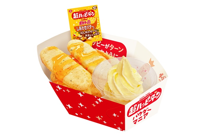 『ポテトチップス しあわせバタ~』らしいあまじょっぱいおいしさを再現いただきました。ハッピーターンの食感と相まってクセになる味わいです!ぜひ『ポテトチップス しあわせバタ~』本体もお試しください。