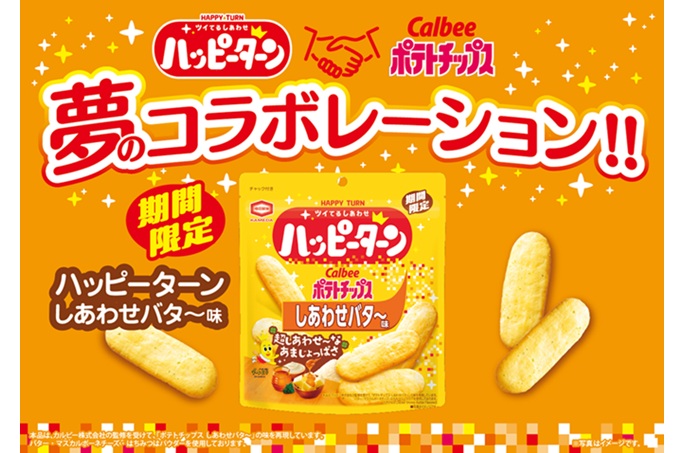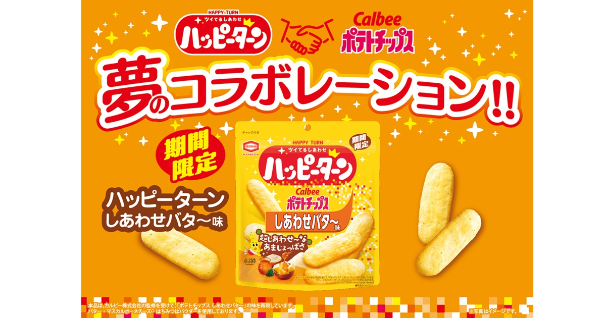 『ハッピーターン しあわせバタ~味』は、あまじょっぱい味わいのハッピーパウダーが特長である亀田製菓の『ハッピーターン』と、カルビーのポテトチップスの中で唯一無二のあまじょっぱいフレーバーである『ポテトチップス しあわせバタ~』がコラボレーションした商品です。カルビー監修のもと、『ポテトチップスしあわせバタ~』の味わいを再現するため、原料にポテトを使用してポテトチップスならではの風味を表現しています。さらに、『ポテトチップス しあわせバタ~』の4つのしあわせ素材(バター、マスカルポーネチーズ、はちみつ、パセリ)とハッピーパウダーを組み合わせることで、超しあわせなあまじょっぱさを実現しています。期間限定の特別なしあわせを、ぜひお楽しみください。