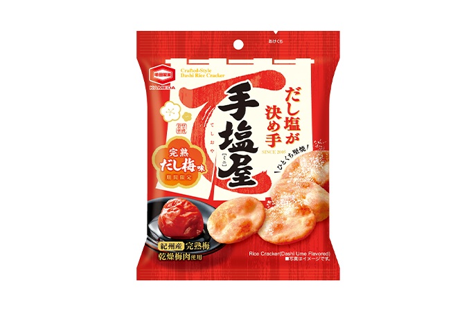 “だし塩が決め手”の「手塩屋」から、だしの旨みと梅のまろやかな風味が味わえる『手塩屋ミニ 完熟だし梅味』がコンビニエンスストア限定で新登場します。食べやすいひとくちサイズの生地を使用しているため、手塩屋ならではのぶくっと焼きのほぐれる食感を存分にお楽しみいただけます。味付けには、紀州産完熟梅の乾燥梅肉を使用。手塩屋ならではのだしの旨みと合わせることで、完熟梅と特製だしが調和した、まろやかな酸味と旨み広がるやさしい味わいに仕上げました。手塩にかけたこだわりのおいしさをどうぞお楽しみください。