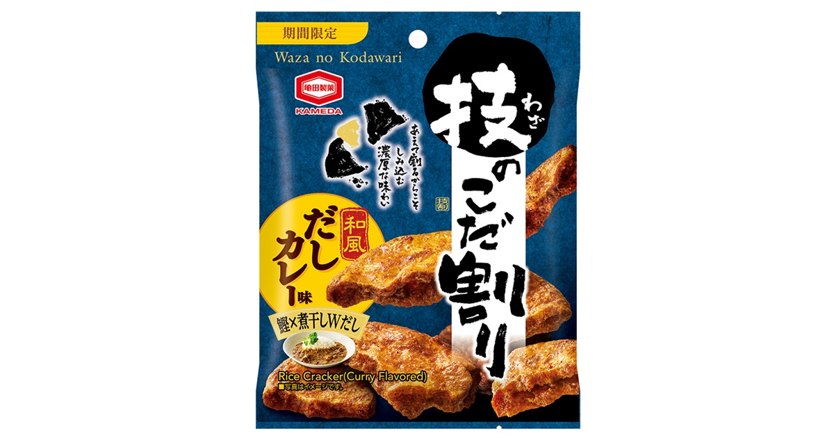 濃厚な味わいと、しっかりとした堅さが特徴の「技のこだ割り」ブランドから、コンビニエンスストア限定で『技のこだ割り 和風だしカレー味』を期間限定で発売します。鰹と煮干しのだしをきかせた香りと旨みが豊かな和風仕立ての特製カレーだれを、あえて割った堅焼せんべいの断面からたっぷりしみこませています。数種類のスパイスと鰹と煮干しのWだしを組み合わせ、技のこだ割りならではの旨み溢れる味わいに仕上げています。袋を開けた瞬間、カレーの奥深い香りが食欲をそそります。香ばしく焼き上げたお米の風味と、和風だしカレーの旨みが一体となった、この季節だけのこだわり尽くした濃厚な味わいをぜひお楽しみください。
