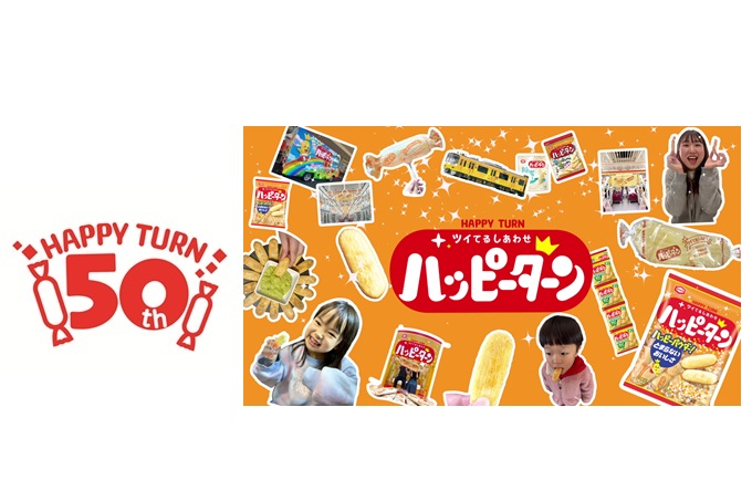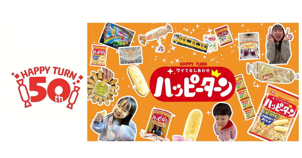 1976年、世の中が少し暗く、元気を求めていた時代に、「幸せ(ハッピー)がお客様に戻って来る(ターン)」ようにという願いを込めて『ハッピーターン』は誕生しました。唯一無二の甘じょっぱい味わいを生み出すハッピーパウダーが特長で、発売以来、子どもから大人まで幅広い世代のお客様に愛されてきました。そして2026年、発売から50年という節目を迎えます。これまでも、そしてこれからも、「お客様に幸せ(ハッピー)が戻って来る(ターン)」ことを願い、ハッピーな体験を生み出し続けます。