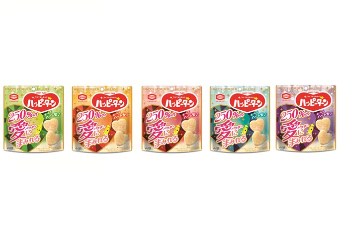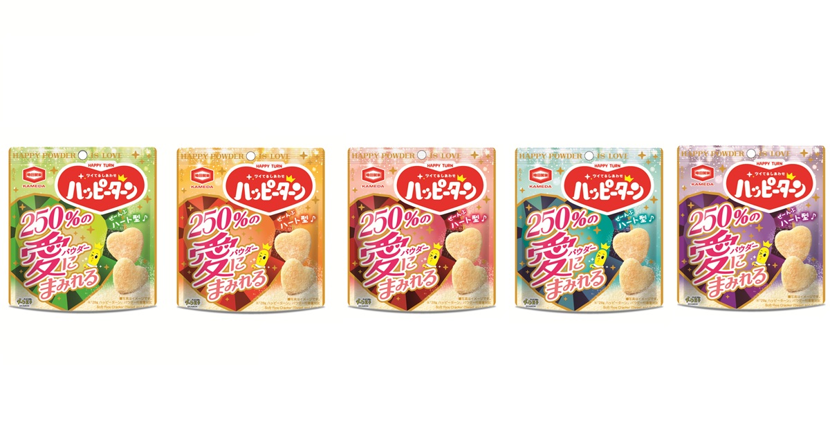 ハート型のハッピーターンは、見つけたらハッピーになれるラッキーアイテムです。全国のコンビニエンスストアで販売している『パウダー250%ハッピーターン』に入っており、遭遇率は【約11袋に1つ】というレアなラッキーアイテムです。今回発売する『250%の愛にまみれるハッピーターン』は、なんとぜーんぶハート型!ハート型のハッピーターンに、いつものハッピーターンの250%※のハッピーパウダーがついた、“しあわせ”がいっぱいの特別なハッピーターンです。大切な人へハッピーを届けるプレゼントとしておすすめです!