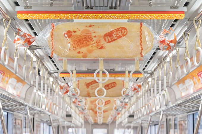 ハッピーターン50周年を記念し、『ハッピーターントレイン』を運行します。京急電鉄が運行する「京急イエローハッピートレイン」は2014年より運行を開始し“沿線に幸せを運ぶ電車”として親しまれてきました。両社の、「お客様を幸せにしたい」という想いが重なり、『ハッピーターントレイン』の運行が実現しました。全8両を商品パッケージデザインや「ターン王子」のイラストで彩り、車内には“日常のハッピー”エピソードや「巨大ハッピーターン」の中吊り広告が掲出されるなど、ハッピーターンの世界観をお楽しみいただける特別仕様になっています。
