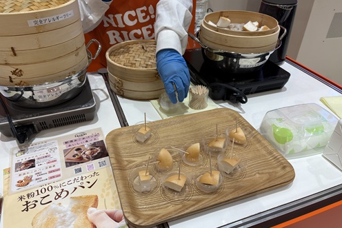 マリンコートの試食ブースでは、亀田製菓の機能性表示食品『熱風焙煎 黒ごまチップス』、タイナイの新潟県産米粉を100%使用した『おこめ丸パン』、尾西食品の長期保存食『尾西のレンジ+ 五目ごはん』『同 カレーピラフ』、マイセンファインフードの新商品『サクサクたんぱく』(3月23日発売予定)をご提供しました。各社2,000食以上を配布し、多くのお客様にお米由来の商品がもつおいしさをご体感いただきました。米粉パンをご試食いただいたお客様からは「温かくて、もちもちして美味しい!」という声が多く聞かれました。