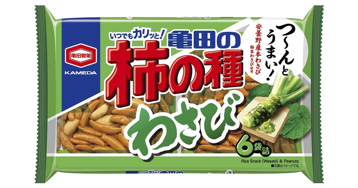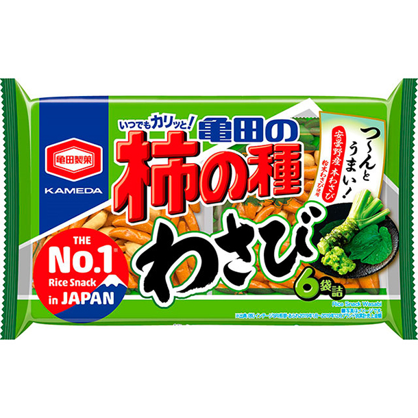 米粉(うるち米(国産))、でん粉、ピーナッツ(ピーナッツ、植物油脂、食塩)、しょうゆ、わさび風味シーズニング、砂糖、魚介エキス調味料、たん白加水分解物、こんぶエキス、粉末わさび/調味料(アミノ酸等)、加工でん粉、ソルビトール、着色料(カラメル、パプリカ色素)、香料、香辛料抽出物、チャ抽出物、乳化剤、(一部に小麦・卵・落花生・大豆・鶏肉・豚肉を含む)