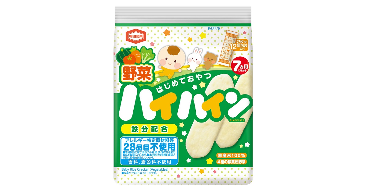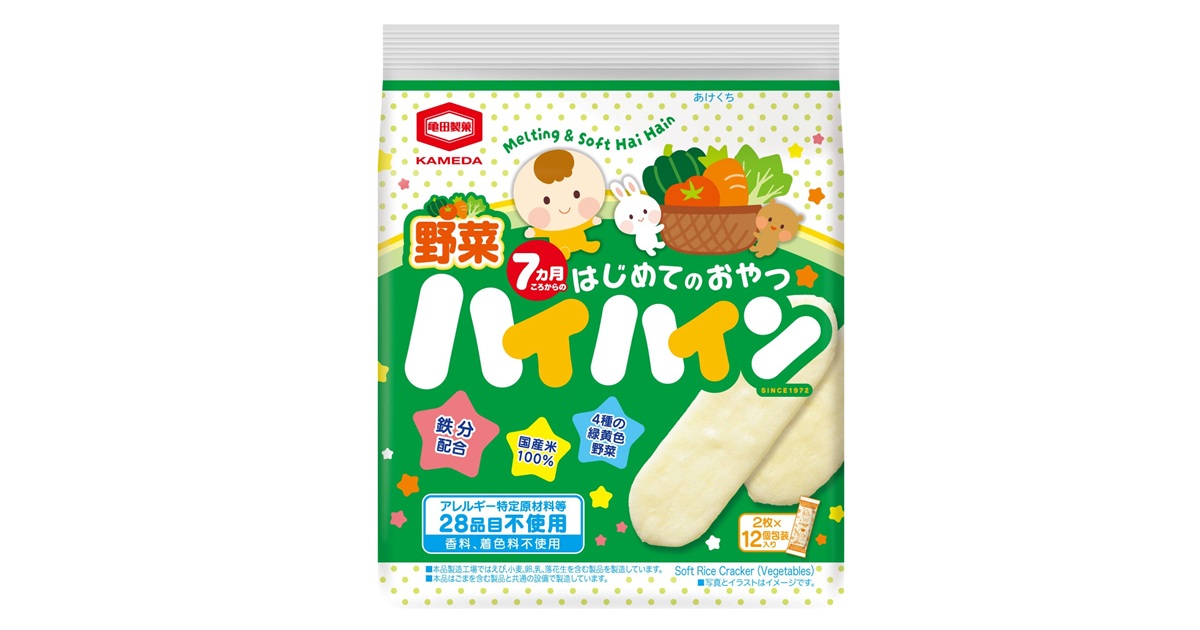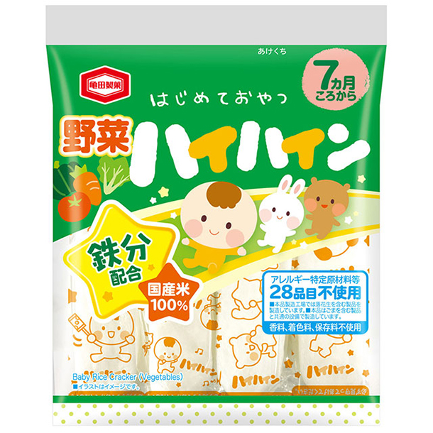 4種の緑黄色野菜(かぼちゃ、ほうれんそう、トマト、にんじん)を練り込みました。鉄分配合。アレルギー特定原材料等28品目、香料、着色料不使用で仕上げ、赤ちゃんのはじめておやつにぴったりです。