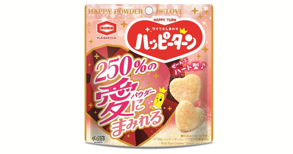 ぜんぶハート型のハッピーターンに、専用のハッピーパウダーが250%ツイた、しあわせいっぱいの特別なハッピーターンです。