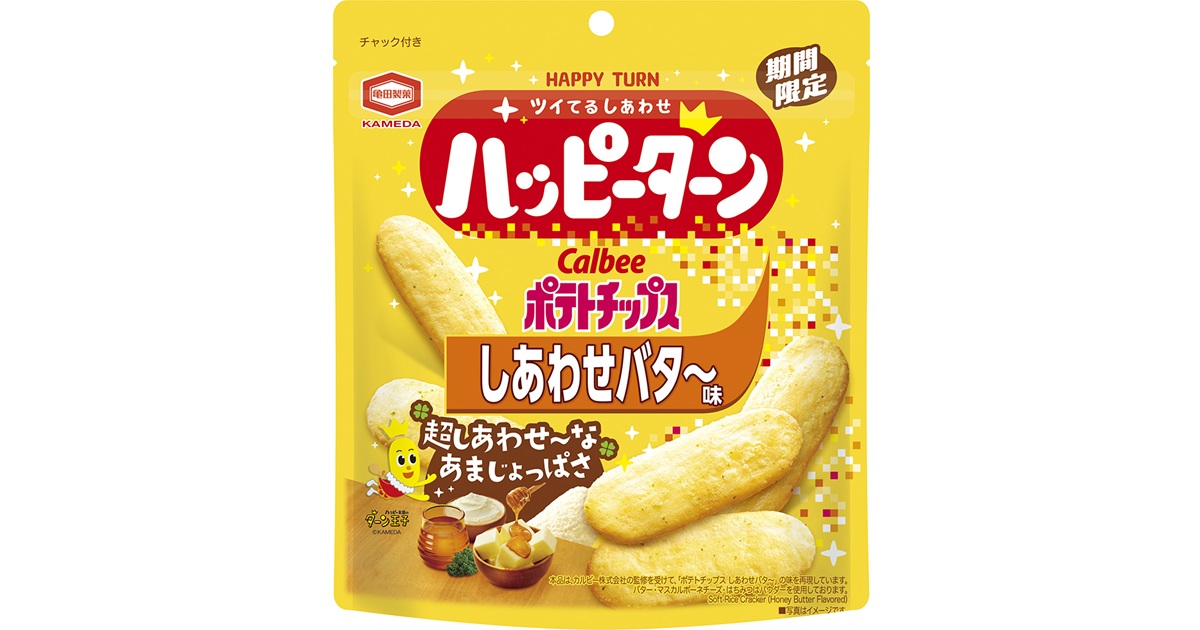 亀田製菓の「ハッピーターン」とカルビーの「ポテトチップス」が夢のコラボレーション!カルビー様監修のもと、『ポテトチップスしあわせバタ~』の味わいを再現しています。