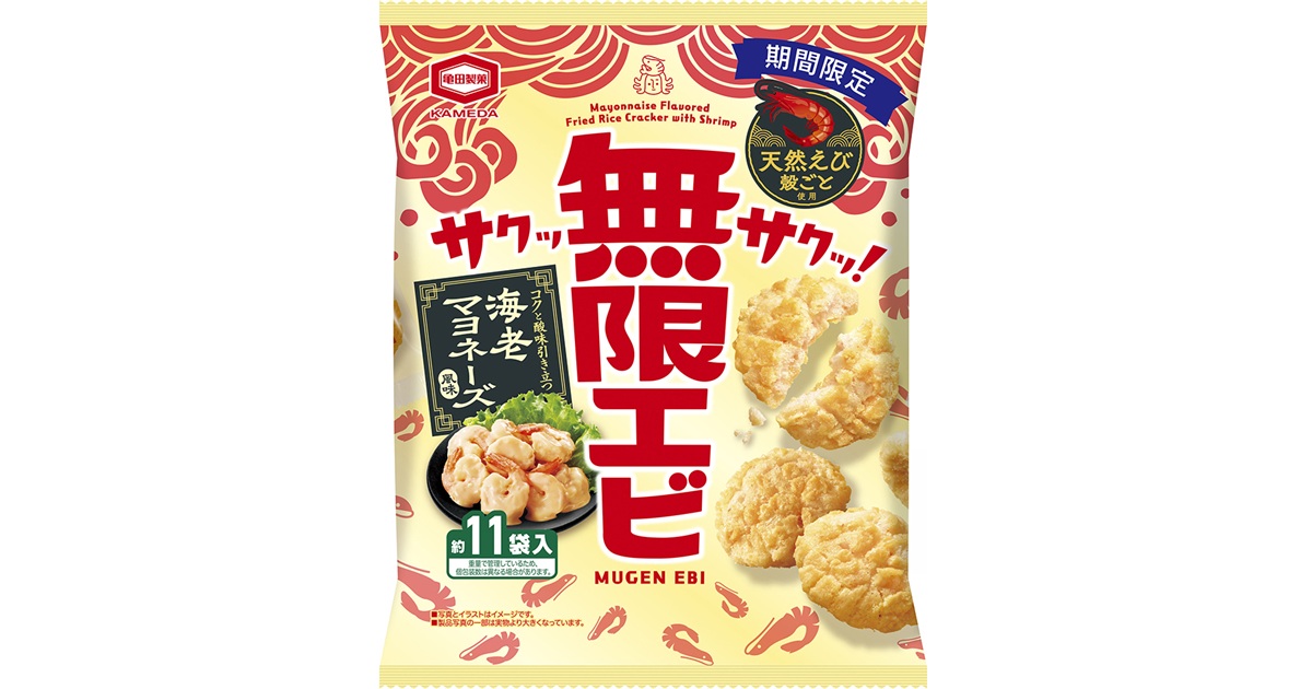 植物油脂(国内製造)、うるち米(米国産)、でん粉、マヨネーズ風味シーズニング、えび、食塩、砂糖、酵母エキスパウダー、のり、ひとえぐさ、魚介エキス調味料、香辛料、青のり、粉末しょうゆ/加工でん粉、調味料(アミノ酸等)、トレハロース、酸味料、香料、着色料(ウコン、トマト色素)、(一部にえび・小麦・ごま・大豆を含む)